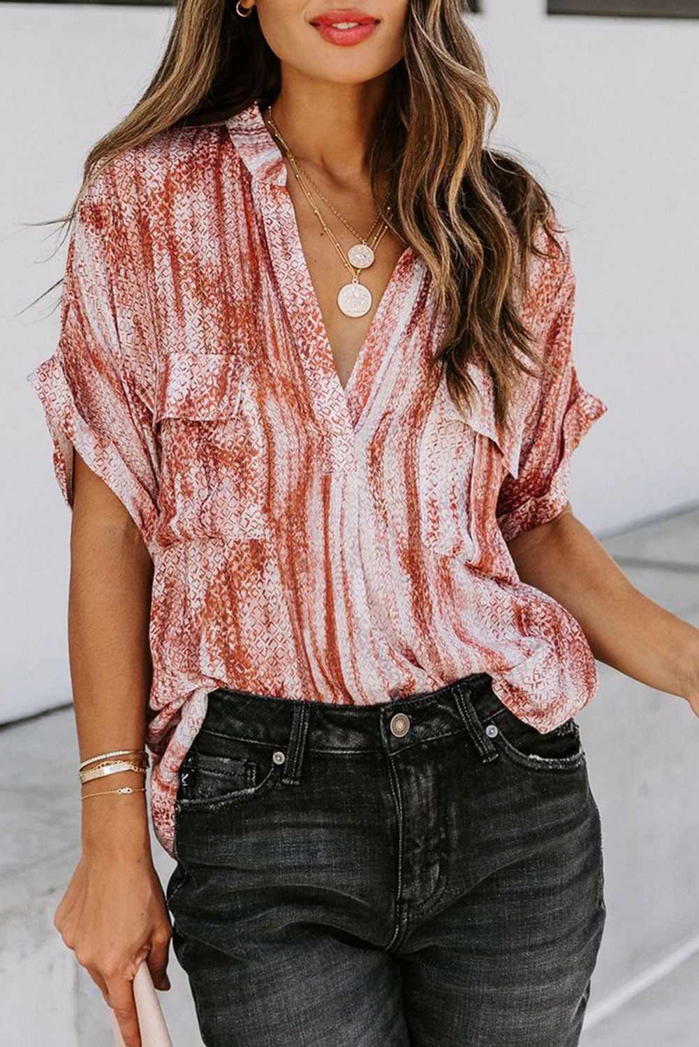 Features a split neckline, two flap bust pockets, and cuffed short sleeves