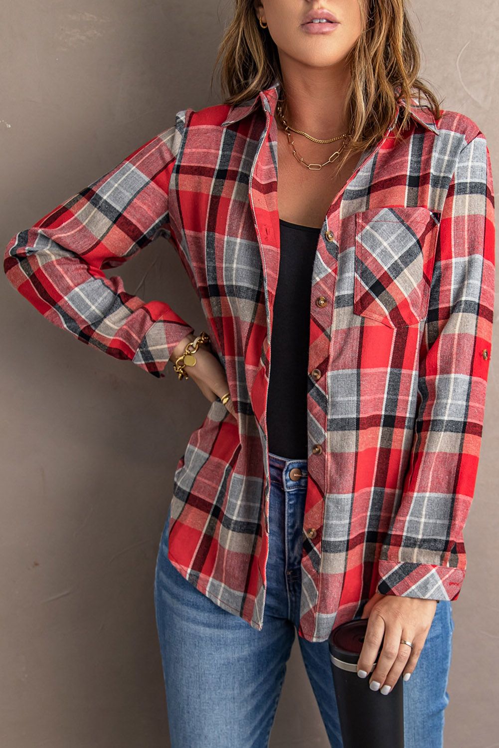 Red Plaid Button Blouse with Pocket