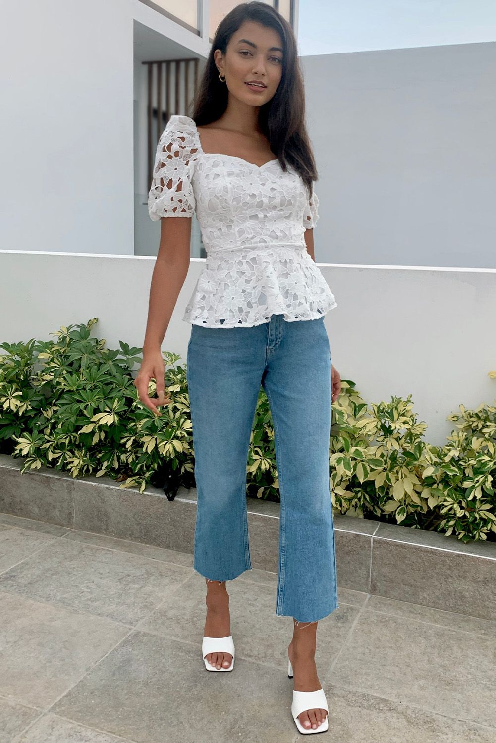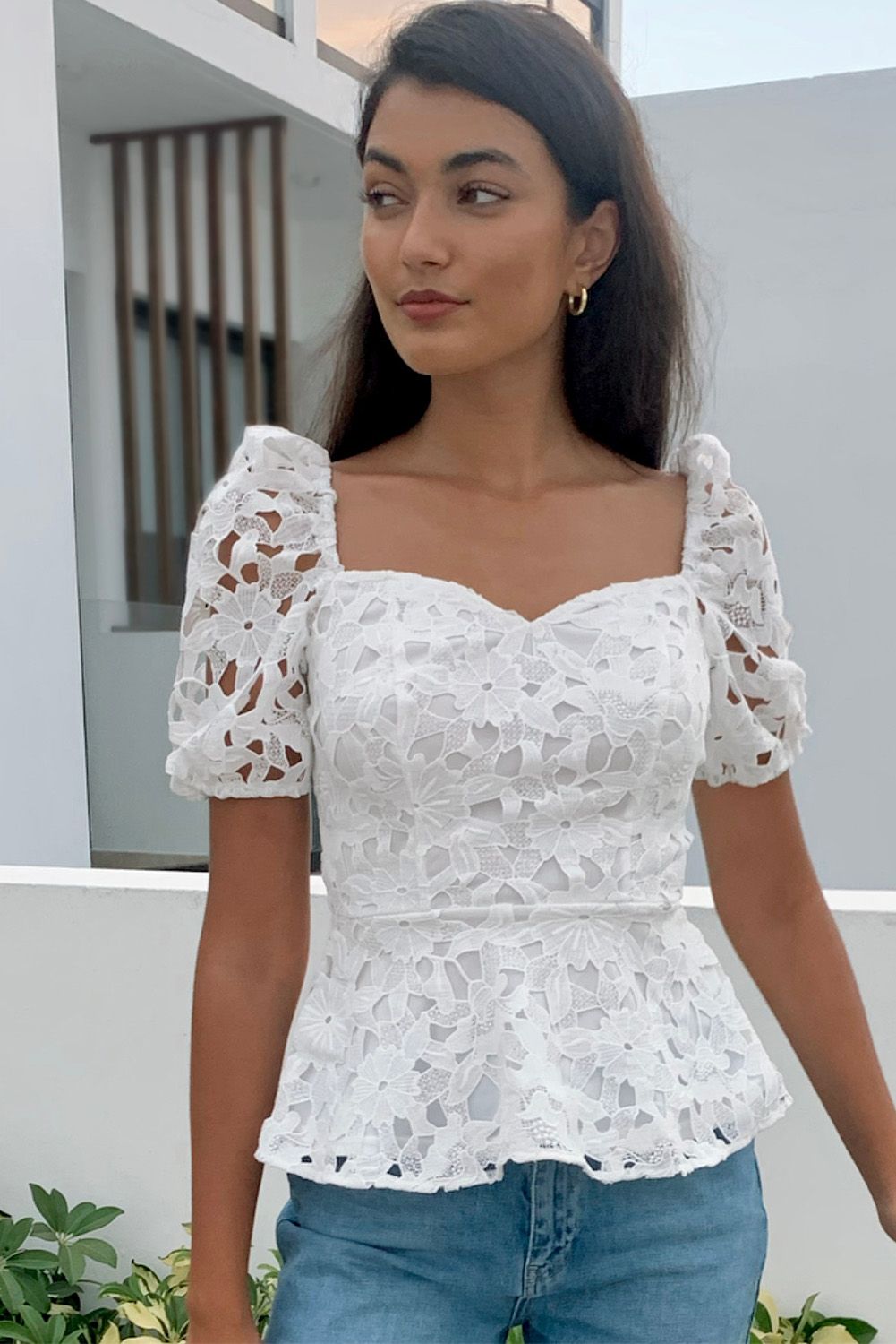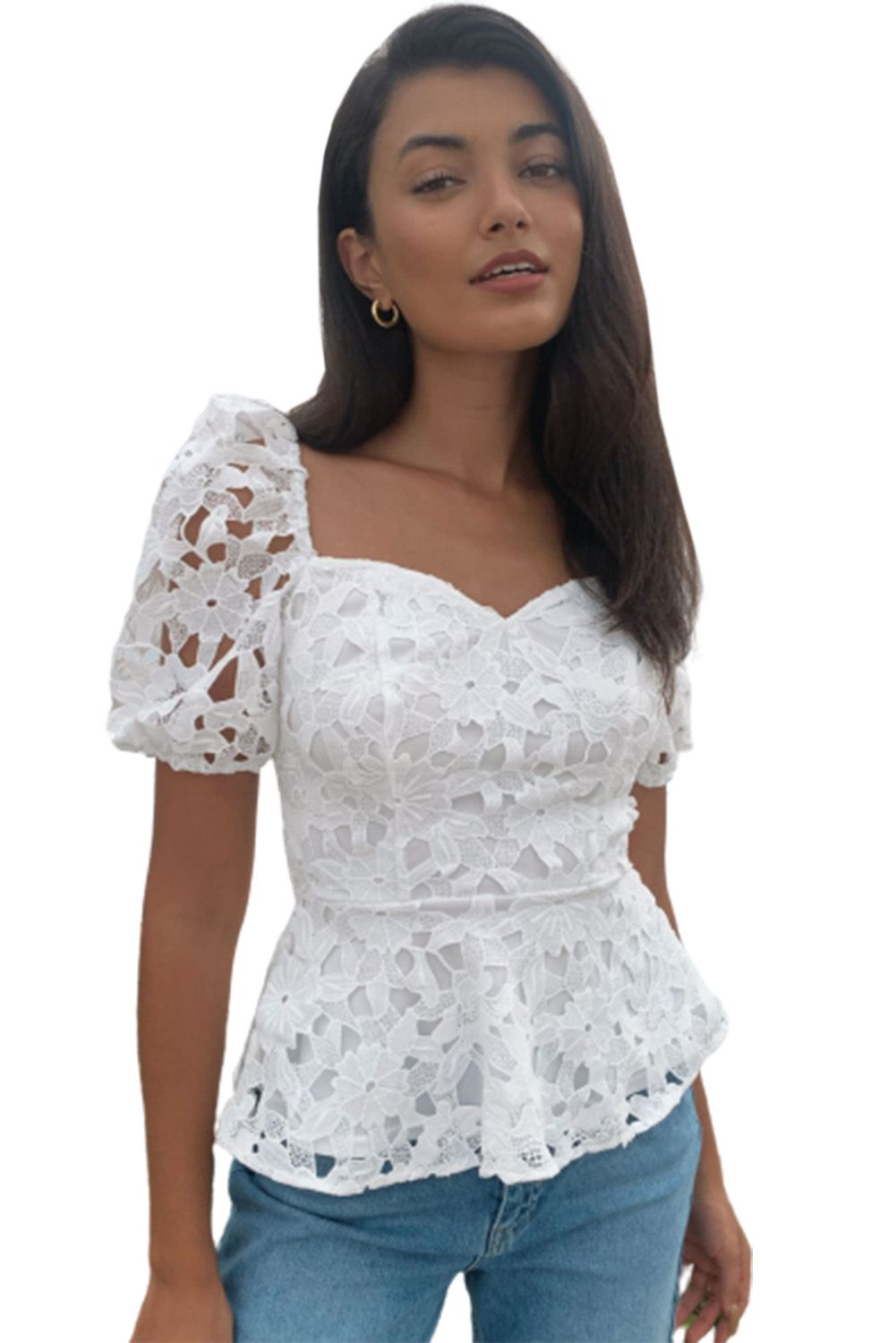 White Lace Hollow out Puff Sleeve Blouse