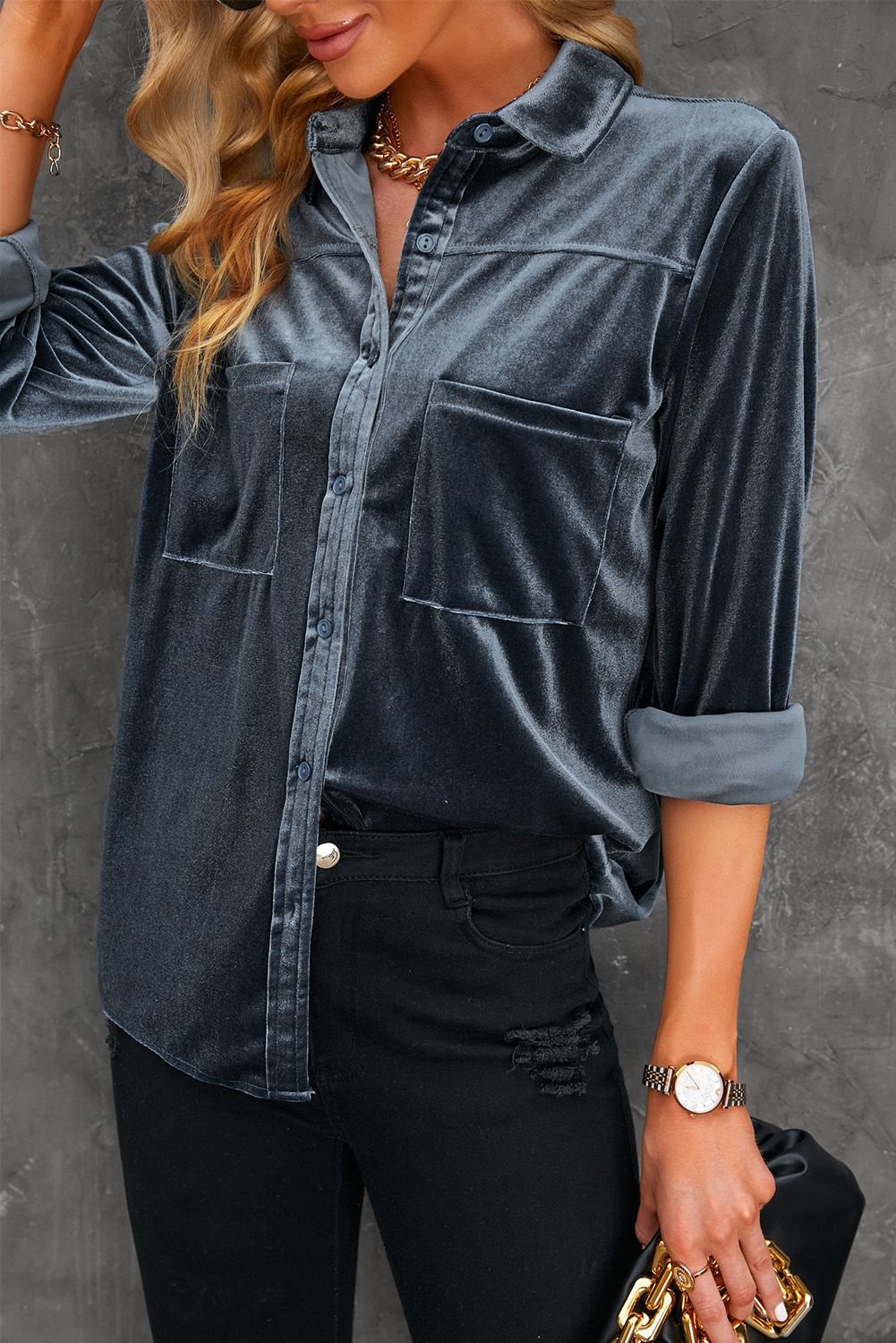 Including long sleeves, lapel collar, button down closure, pockets