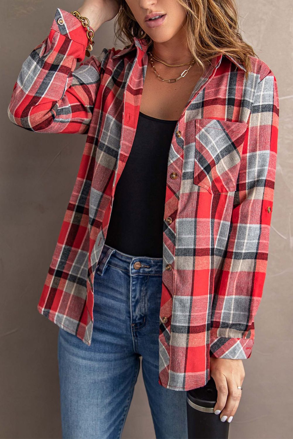 Red Plaid Button Blouse with Pocket