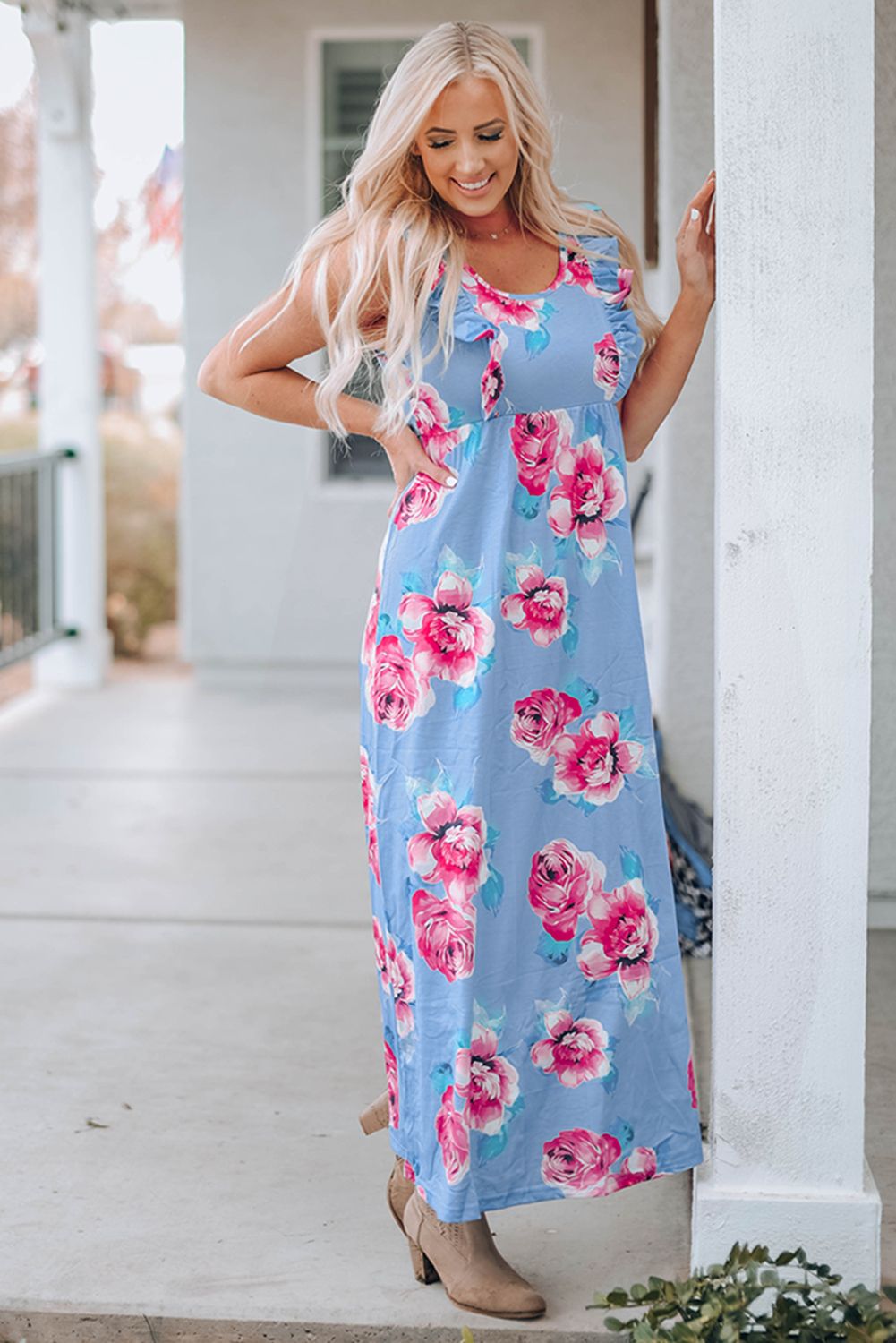 This floral dress with a charming look is perfect for the summer parties The ruffled design on the bodice is graceful and attractive for modern ladies Women's maxi dress has a scoop neck, sleeveless and floor-length cut We love its blooming floral pattern which is vibrant and full of charming Boho maxi dresses have been always popular among people, thousands of styles to choose