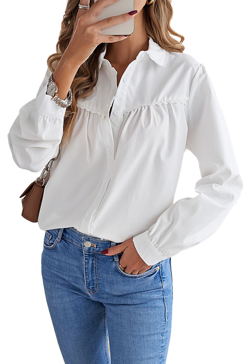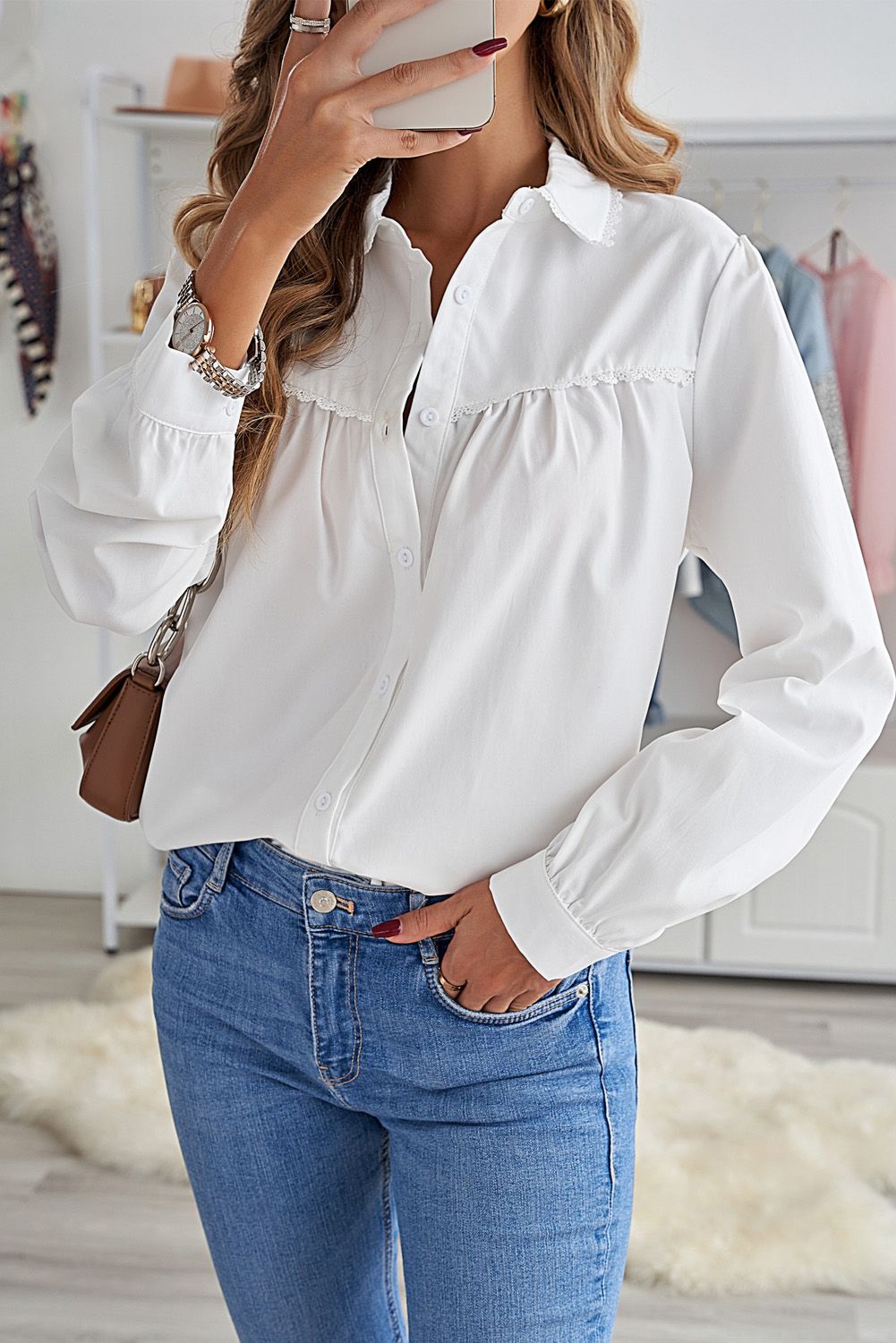 Turn-down collar, pleated with lace detail on bust, buttons closure done