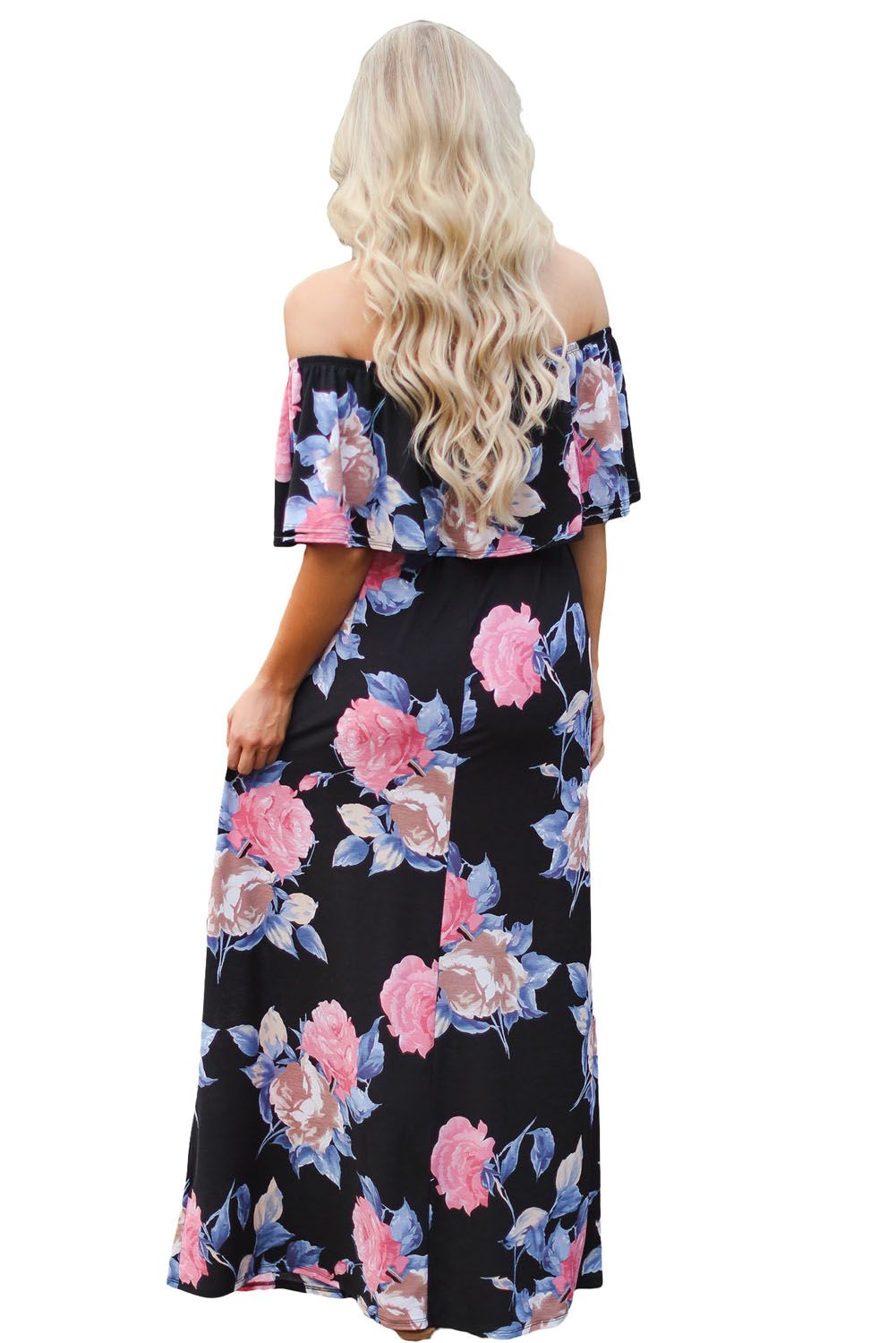 Flower Print Black Grounding Off Shoulder Long Boho Dress