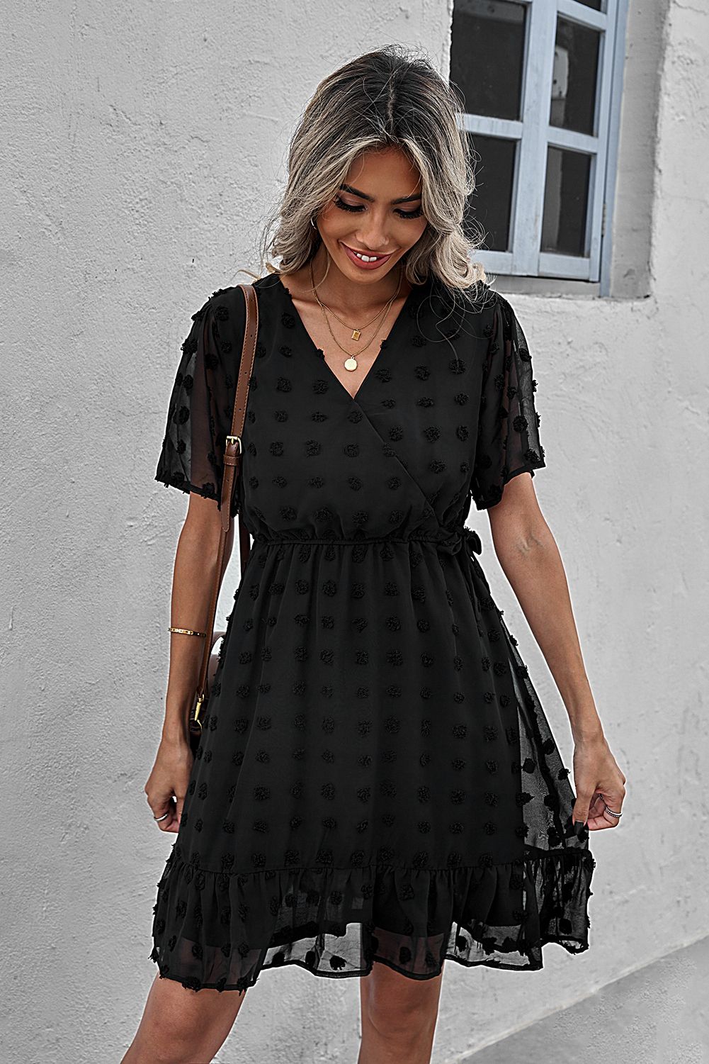 Black Wrap V Neck Swiss Dot Mini Dress with Ruffles