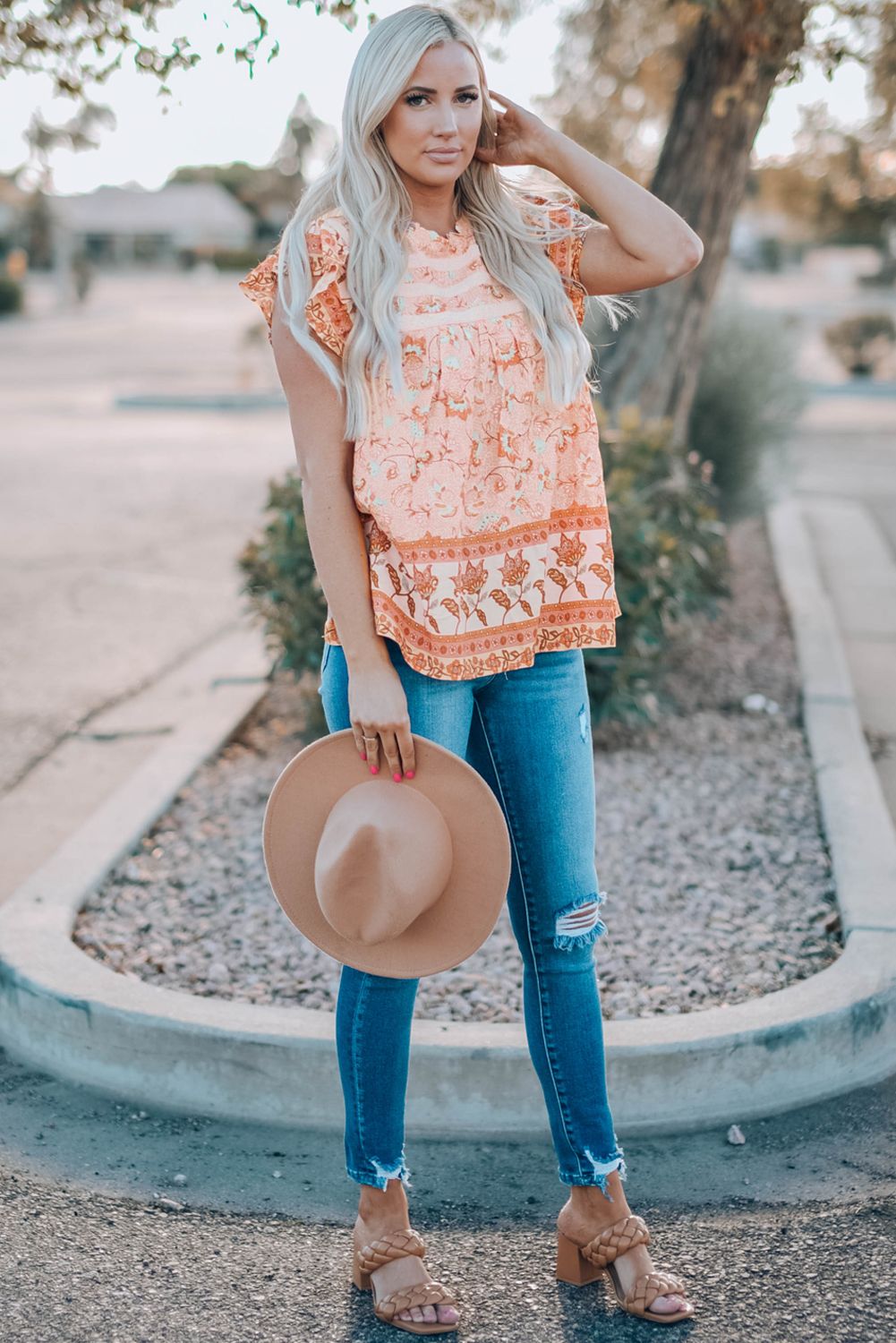 Our Floral Print Ruffled Crew Neck Sleeveless Top embodies boho vibes