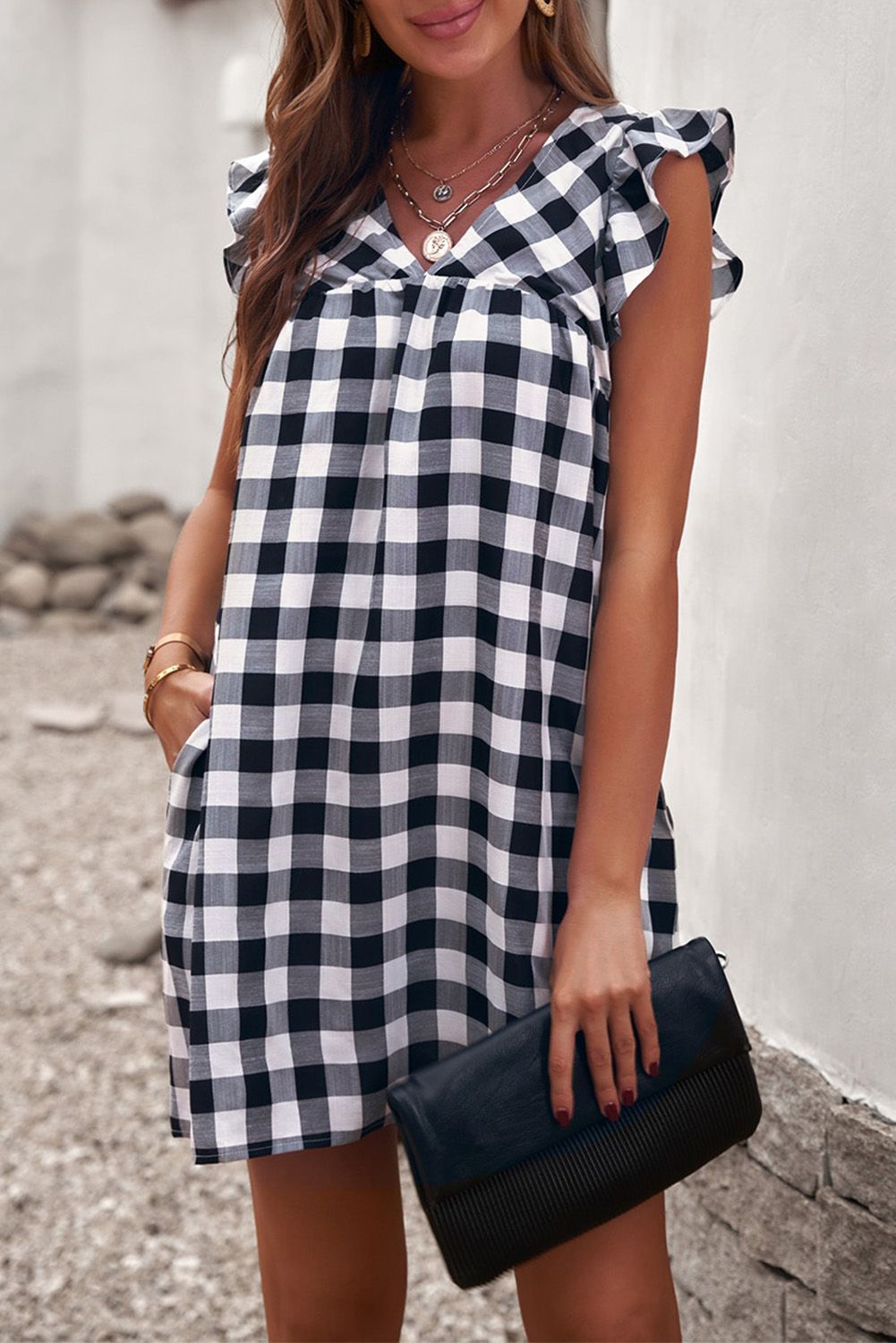 This sweet babydoll silhouette features black and white gingham checks, flutter cap sleeves and side pockets
