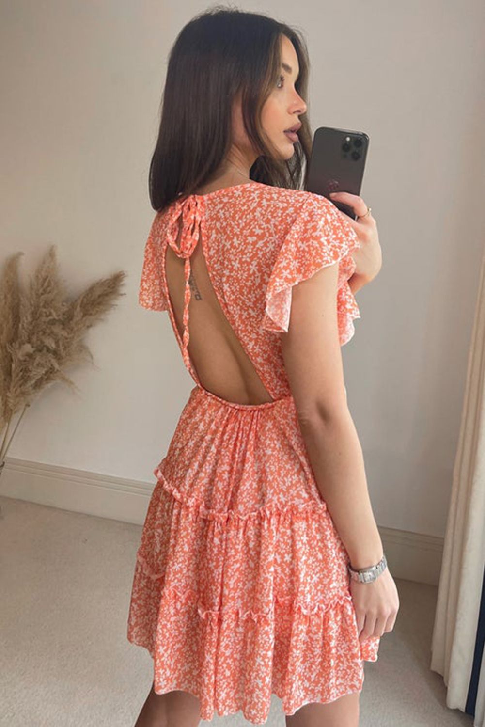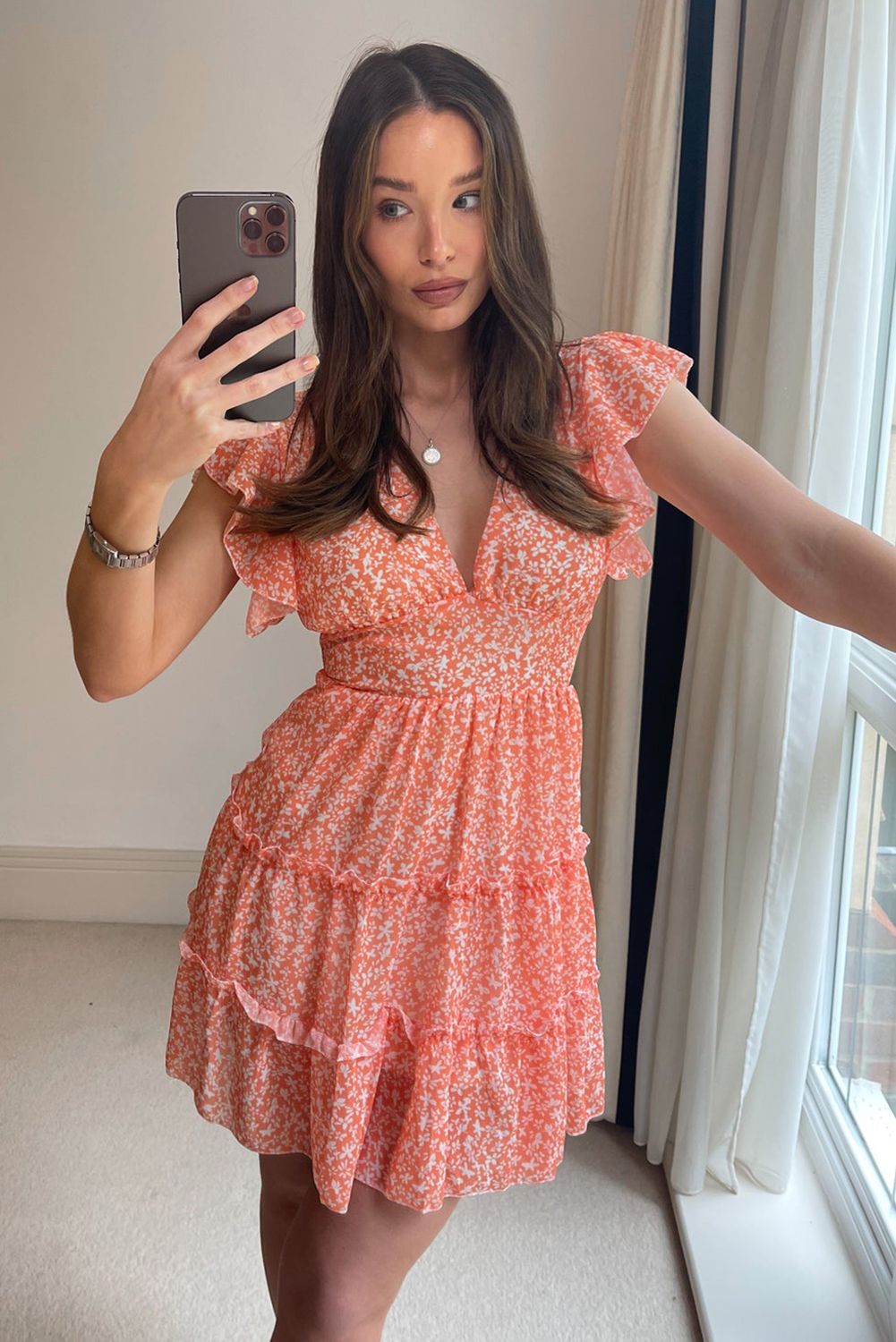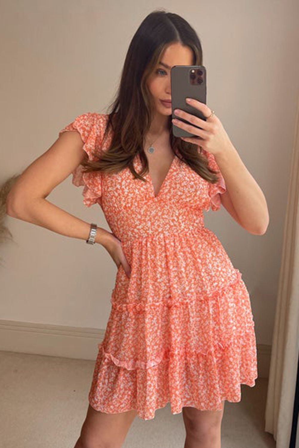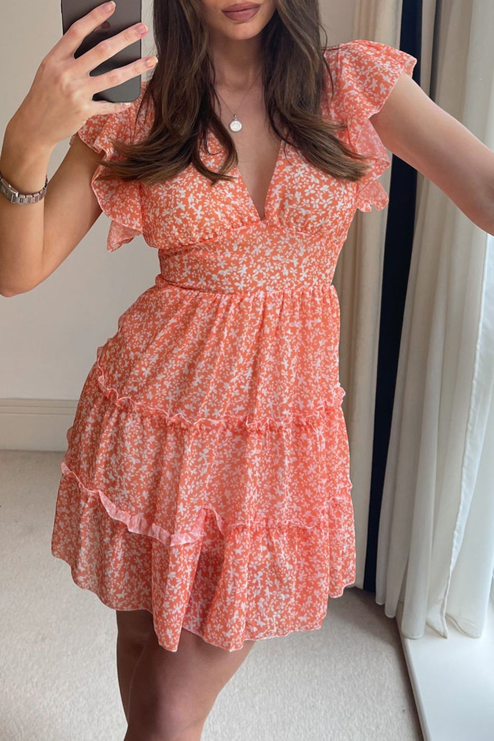 - Ditsy floralprint and rufflesmake this shortdress elegant and fashionable